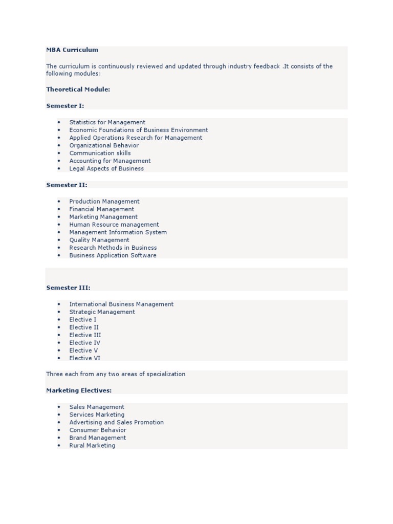 Marketing Elective Courses………… to revise preliminary BBA and MBA in Business Administration Curriculum. The following members attended the meeting:- 1. the participants to distinguish MBA curriculum from the BBA by integrating four ... Fetch Document